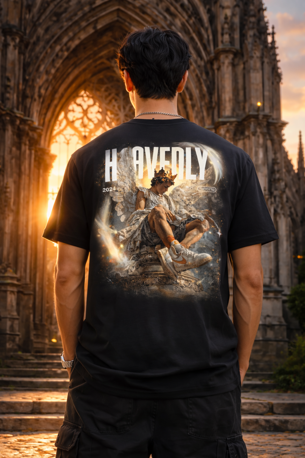 El gráfico central presenta un ángel coronado con estética contemporánea, rodeado de luz y detalles celestiales que contrastan con el fondo oscuro de la prenda. El resultado es una pieza única que fusiona espiritualidad, arte y moda urbana.